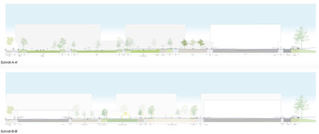 Das vorliegende bauliche Konzept des Wettbewerbs sieht sich als integraler Bestandteil des städtebaulichen Gesamtkonzeptes und ist als Weiterführung der Intentionen des angrenzenden B-Plan-Areals und der städtebaulichen Gesamtkonzeption zu verstehen. Insbesondere die Fortsetzung der Struktur der grünen Inseln im Wohngebiet wird konsequent fortgeführt und durch konzentrierte, öffentlich nutzbare Freiräume ergänzt. Gleichzeitig wird die bestehende städtebauliche Grundidee des Wohngebietes in Form der Quartiersbildung durch zeilenartige Randbebauung, aufgegriffen und neu interpretiert. Die Gebäude des Bildungszentrums öffnen sich dem Areal, schaffen Zugehörigkeit und werden Teil des gesellschaftlichen Lebens. Die Kernthemen Bildung und Erholung schaffen Synergien in Städtebau und Nutzung. Die Mensa bzw. Aula lädt durch ihre solitäre Lage Anrainer und Besucher ein. Ebenso ist eine öffentliche Teilhabe an den Sportanlagen auf dem Campus möglich. Gleichzeitig wird in Richtung Nordosten durch die vorgesehene Blockrandbebauung ein baulicher Abschluss des Wohngebietes mit einer daraus resultierenden Raumbildung in Richtung Südwesten umgesetzt. Die Schaffung einer durchgrünten Campussituation mit einer differenziert bespielbaren Nutzbarkeit, bietet dabei eine hohe Aufenthaltsqualität. Der grüne Vorplatz öffnet sich zum Wohngebiet und integriert sich in die Gesamtkonzeption des städtebaulichen Umgriffs. Wesentliches Entwurfsziel ist die maßstäbliche Integration der nicht unerheblichen Baumassen des neuen Bildungszentrums in den Kontext des Umfeldes auf dem Grundstück aber auch in die städtebauliche Gesamtsituation der Umgebung. Dabei wird eine signifikante Adressbildung der Schule mit einem zentralen Eingangsbereich angestrebt, der die Willkommenskultur der Einrichtung abbildet und eine optimale Zugänglichkeit aus allen Richtungen ermöglicht. Zudem soll eine nachvollziehbare und flexible Funktionalität umgesetzt werden, die den aktuellen Erfordernissen einer zeitgemäßen Berufsschule Rechnung trägt, aber ebenso auf zukünftig wechselnde Bedarfe flexibel reagieren kann. Ziel ist ebenso eine gute Orientierung der Nutzer im Gebäude und eine identitätsstiftende Wahrnehmung der Gebäude und Freianlagen. Der Eingangsbereich ist der zentrale Ankommens- und Sammlungsbereich des Ensembles und gleichzeitig Auftakt einer Erschließungsachse im Erdgeschoß, die alle Schulbereiche miteinander verbindet. Diese einfache Erschließungslösung ermöglicht eine gute Orientierung innerhalb des Gebäudes und bietet zudem kurze Wege zu den unterschiedlichen Funktionsbereichen. Gleichzeitig wird durch die alternierende Abfolge von Kommunikationsflächen, Sitzstufen und begrünten Innenhöfen eine lebendige und attraktive Lernlandschaft entwickelt. So ergänzt beispielsweise ein Café, zum Campus ausgerichtet, das Angebot der Aktivitäten im Erdgeschoß. Durch die duale Realisierung von Eingangszonen sowohl im Norden, also dem Bereich der Erschließung durch die Straßenbahn, als auch von Süden in Richtung Wohngebiet und Campus wird eine transparente und signifikante Durchwegung der Erdgeschoßzone umgesetzt. Im Sinne einer flexiblen Zugänglichkeit der einzelnen Schulbereiche, erhält jede Funktionseinheit sowie die Sporthalle eine zusätzliche äußere Erschließung am Campus. Das Gebäude für die Mensa bzw. Aula ist städtebaulich zugleich signifikanter Auftakt und Verbindungselement zum angrenzenden Wohngebiet. Durch die bewusste Situierung als Solitär, herausgelöst aus den übrigen Schulgebäuden, ist das Gebäude gut geeignet für externe Nutzungen wie z.B. als Stadtteil-Café, Einwohnertreffpunkt oder multifunktionale Versammlungsstätte. Alle Gebäude der Schulbereiche in den Obergeschossen sind nach dem gleichen Grundtypus entwickelt, sodass ein Wechsel bzw. Substitution einzelner Funktionseinheiten unproblematisch möglich ist. Durch die gewählte SB-Skelettbauweise mit Holzhybriddecken und flexiblen Raumtrennwänden ist eine spätere Umnutzung kurzfristig und wirtschaftlich zu realisieren. Ebenso kann die modular aufgebaute Fassade auf zukünftige Veränderungen im Inneren des Gebäudes gut reagieren. Die Erschließung des Areals mit motorisiertem Individualverkehr erfolgt ausschließlich aus Richtung Süd und Ost und konzentriert sich dabei auf ein möglichst kreuzungsfreies Erreichen. Die P+R Stellplätze werden via eigener Zufahrt von der Plater Straße erschlossen. Barrierefreie Stellplätze werden im Nordosten in Gebäudenähe positioniert. Die Andienung der Mensa erfolgt ebenfalls im Süden. Somit ist der gesamte Freiraum des Areals als verkehrsfreie Zone (motorisiert) ausformuliert. Das Umfahren der Gebäude für Rettungseinsätze ist gewährleistet. Fahrradstellplätze werden dezentral an allen Zugängen des Areals positioniert. Durch die angemessene Platzsituation im Norden wird das Ankommen per Tram zu Stoßzeiten abgefangen. Alle Freiräume sind barrierefrei erschlossen. Die Geh- und Radwegeverbindungen nördlich und südlich des Perimeters werden sinnvoll und konsequent fortgeführt. Die Freianlagen bilden einen wesentlichen Teil des Entwurfsansatzes und wurden gemeinsam mit den hochbaulichen Lösungen gegenseitig erdacht. Vorgeschlagen wird ein Freiraumtypus, der einen stark durchgrünten Campuscharakter aufweist. Bewusst wurde auf die Ausbildung eines reinen Schulhofes oder einer Parklandschaft verzichtet. Viel mehr öffnet sich der Freiraum durch den gefassten, ruhigen Städtebau, multicodierte Nutzungsmöglichkeiten und durch eine klare Durchwegung, gleichsam für alle Nutzergruppen. Räumlich gliedert sich der Campus unauffällig in drei Teilbereiche. Erholung – Sport - Kommunikation. Einzelne unterschiedlich große Taschen öffnen und schließen sich innerhalb des Campus zu lebendigen Kommunikationszonen, Rückzugs- und Ruhebereichen, Schatten- und Liegewiesen, schaffen Abwechslung und verbinden sich durch gleichmäßige Rhythmik. Die Sportbereiche werd